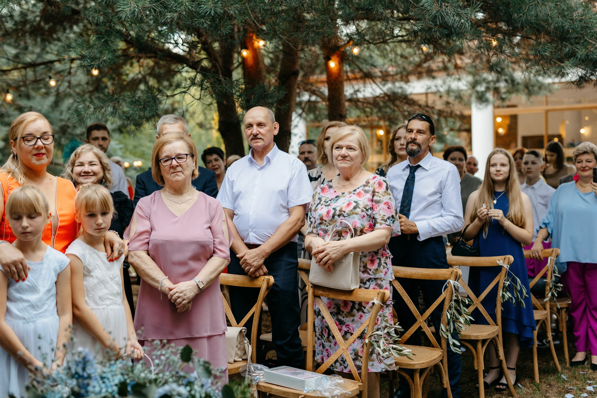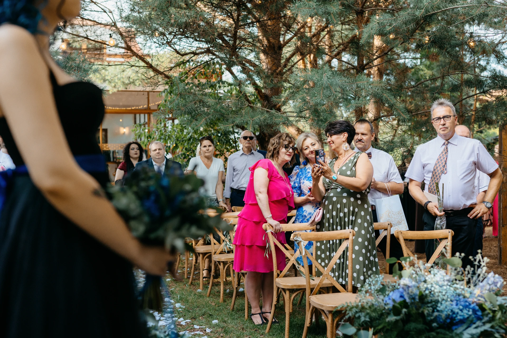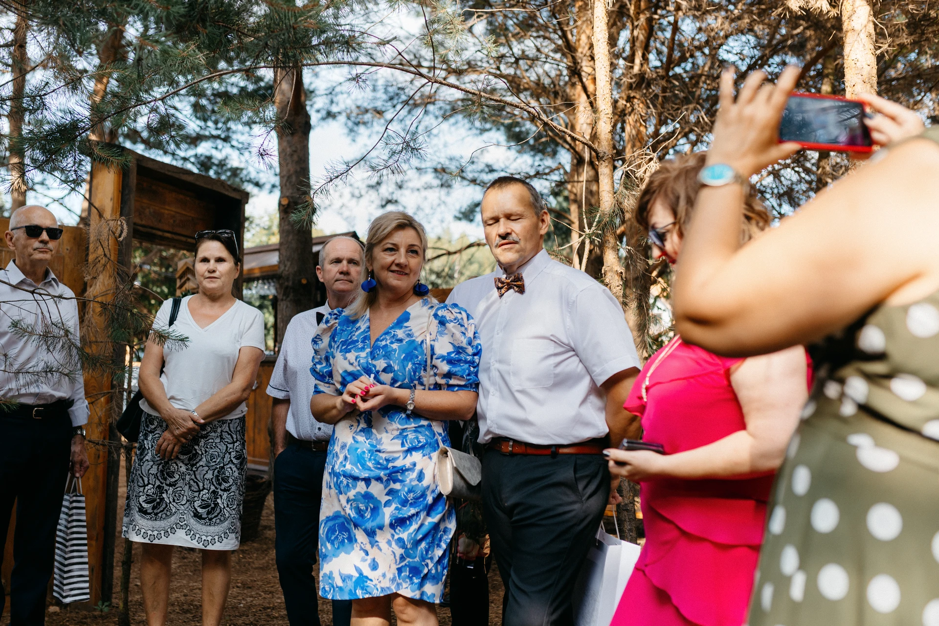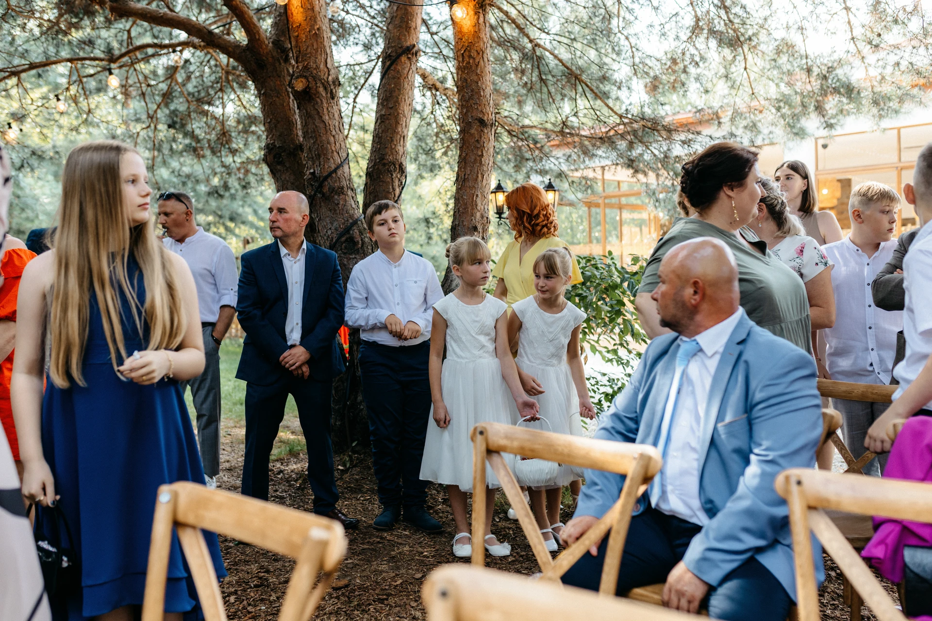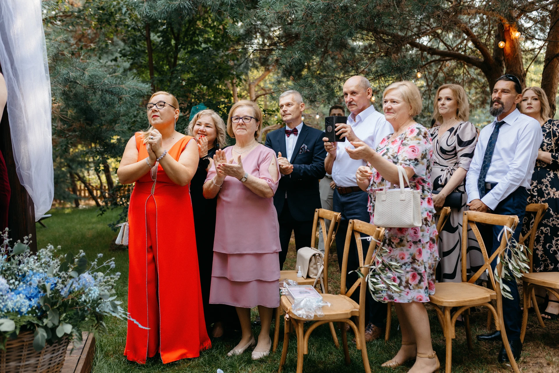 Ceremonia ślubu cywilnego Julii i Mateusza odbyła się w Miodowym Zakątku, miejscu, które wprost idealnie nadaje się do powiedzenia „tak” blisko natury. Altanka ślubna, otoczona przez wysokie drzewa jest totalnie częścią leśnego krajobrazu. Wyobraźcie sobie ciepły lipcowy dzień, słońce przedzierające się przez liście, delikatny wiatr poruszający gałęziami – dokładnie tak wyglądała ta magiczna ceremonia. Goście zebrali się wokół altanki, a atmosferę co i rusz wypełniały wzruszenia i szczere, szerokie uśmiechy.