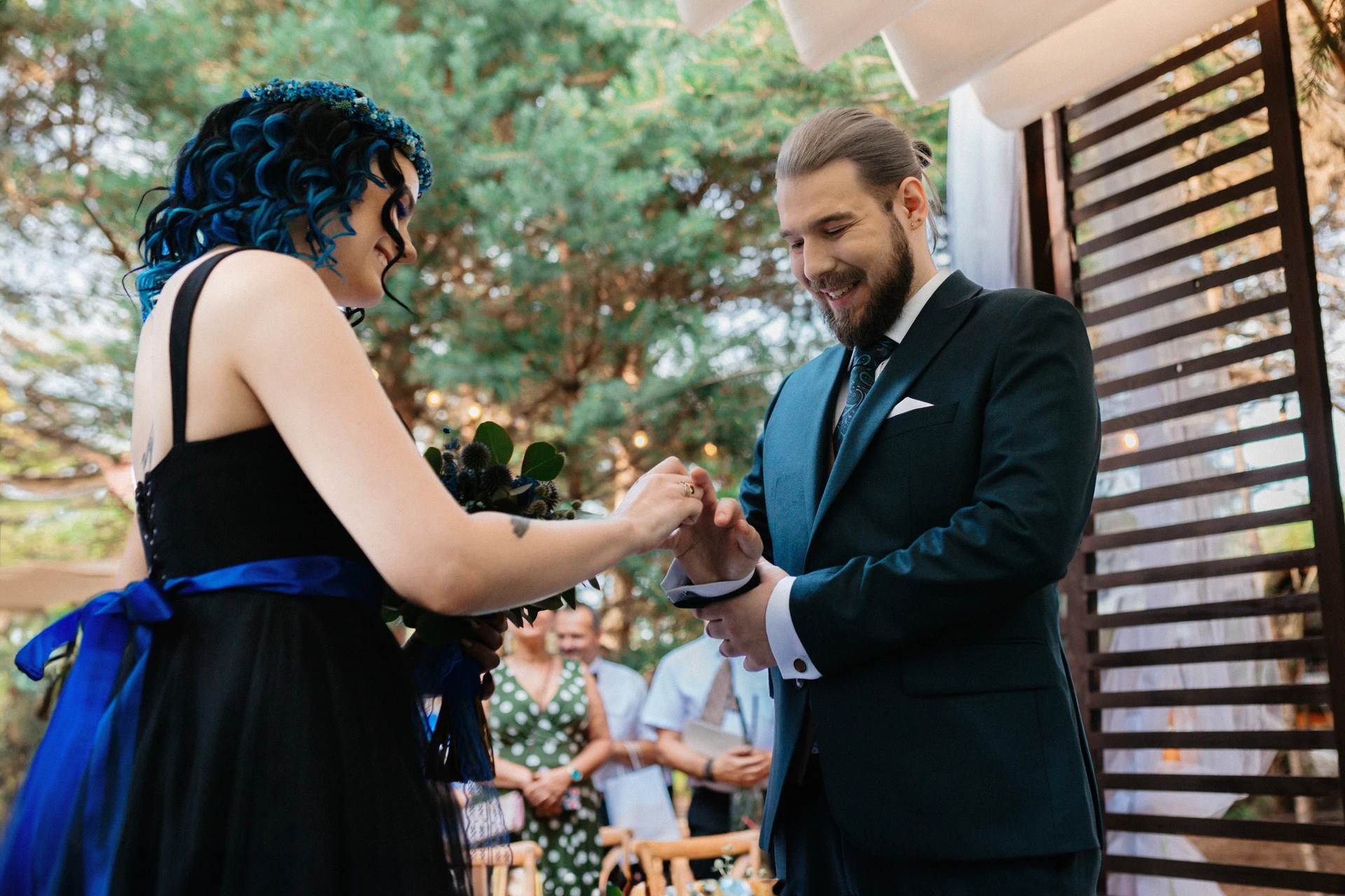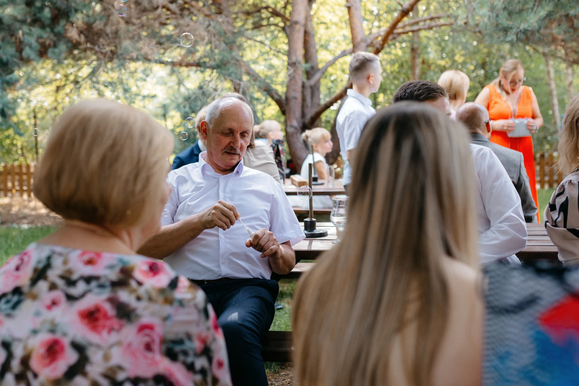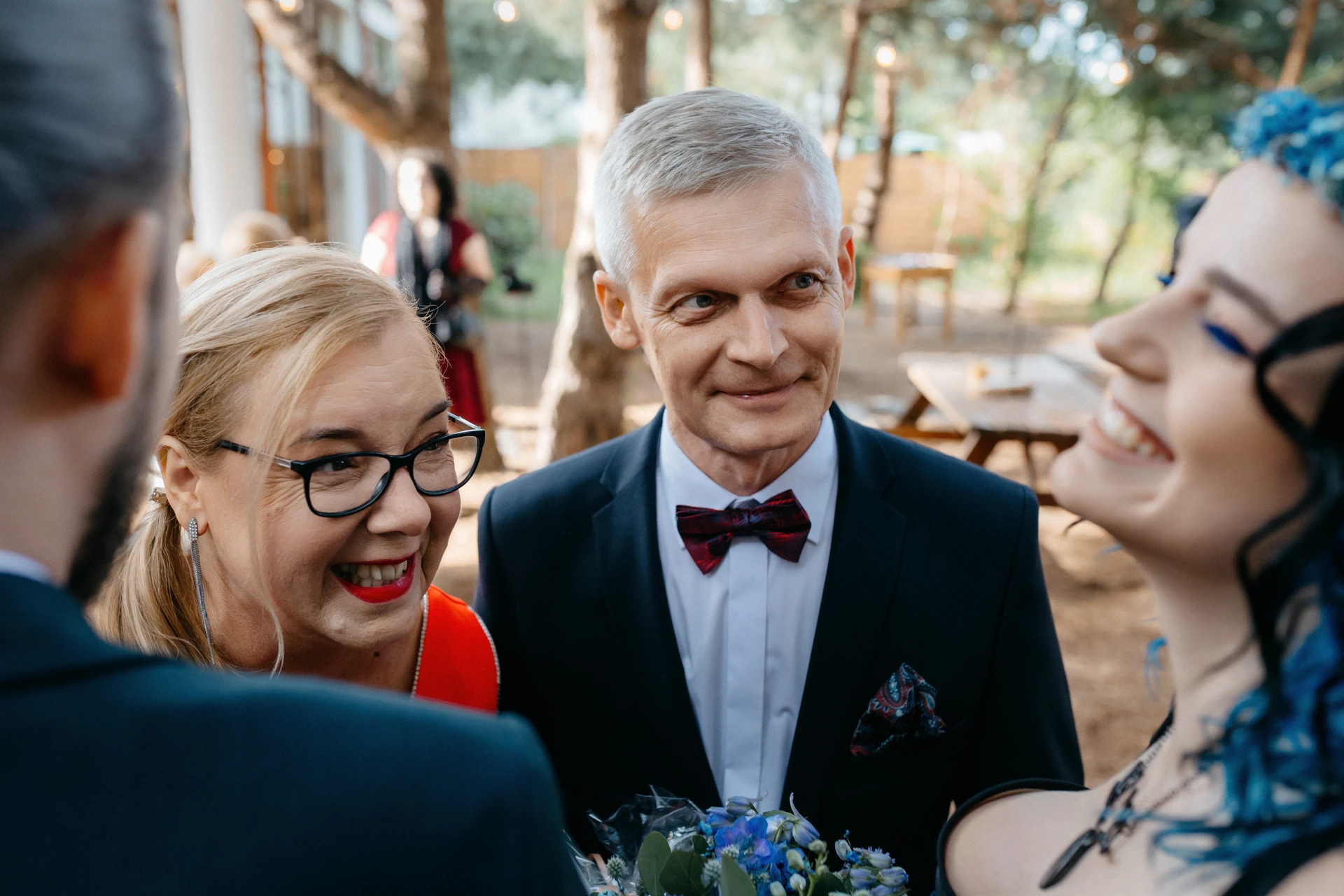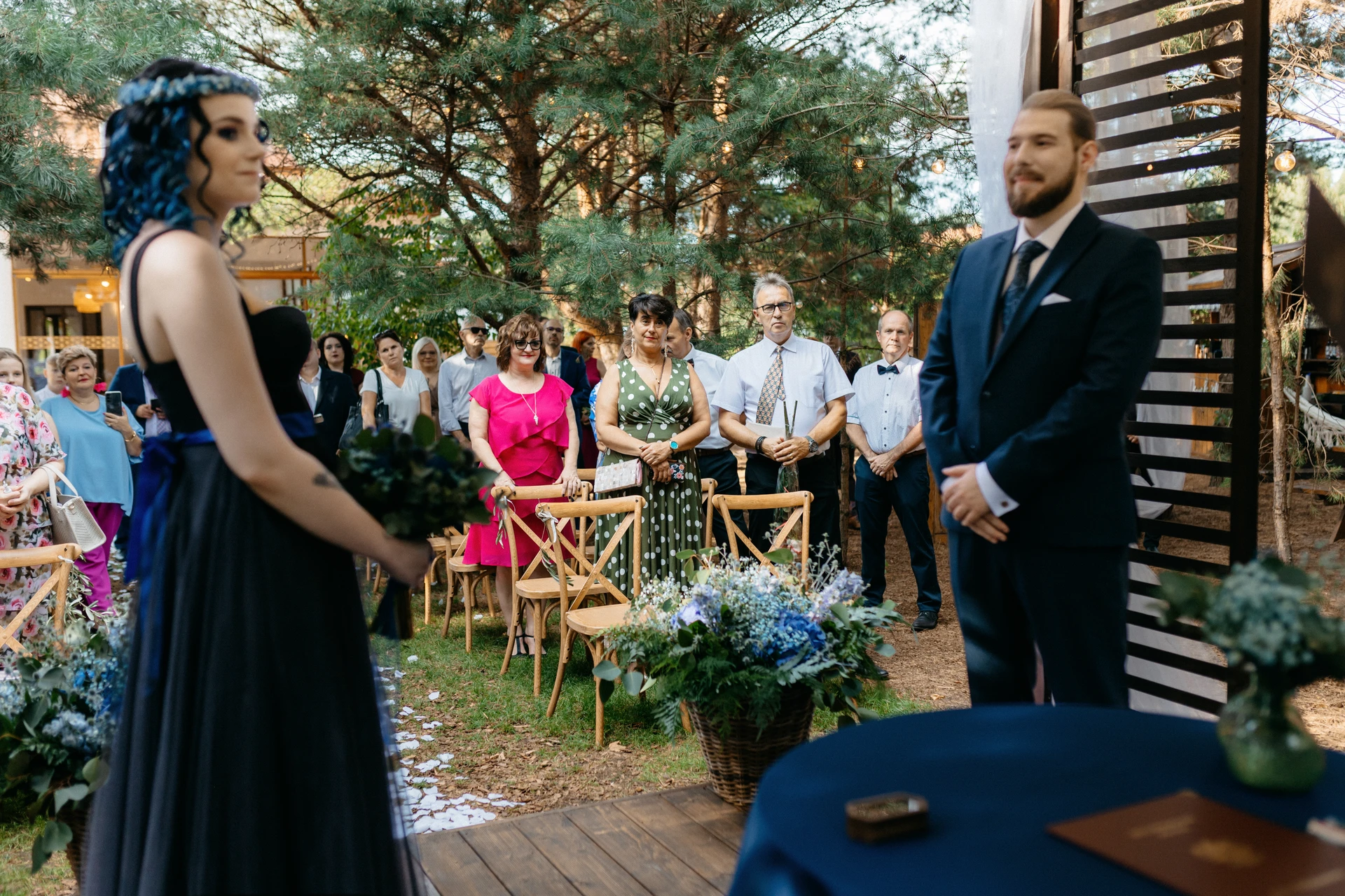 Ceremonia ślubu cywilnego Julii i Mateusza odbyła się w Miodowym Zakątku, miejscu, które wprost idealnie nadaje się do powiedzenia „tak” blisko natury. Altanka ślubna, otoczona przez wysokie drzewa jest totalnie częścią leśnego krajobrazu. Wyobraźcie sobie ciepły lipcowy dzień, słońce przedzierające się przez liście, delikatny wiatr poruszający gałęziami – dokładnie tak wyglądała ta magiczna ceremonia. Goście zebrali się wokół altanki, a atmosferę co i rusz wypełniały wzruszenia i szczere, szerokie uśmiechy.