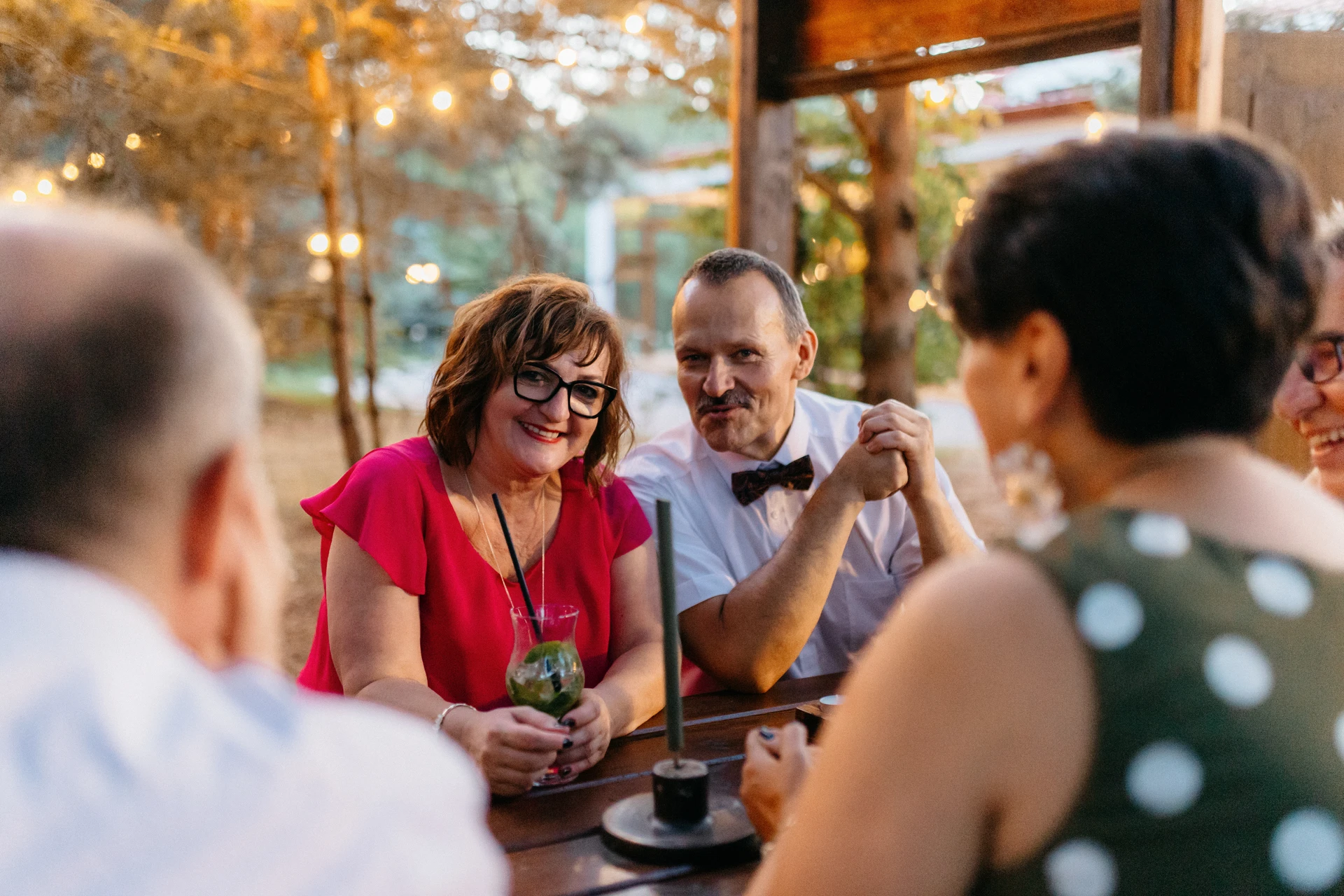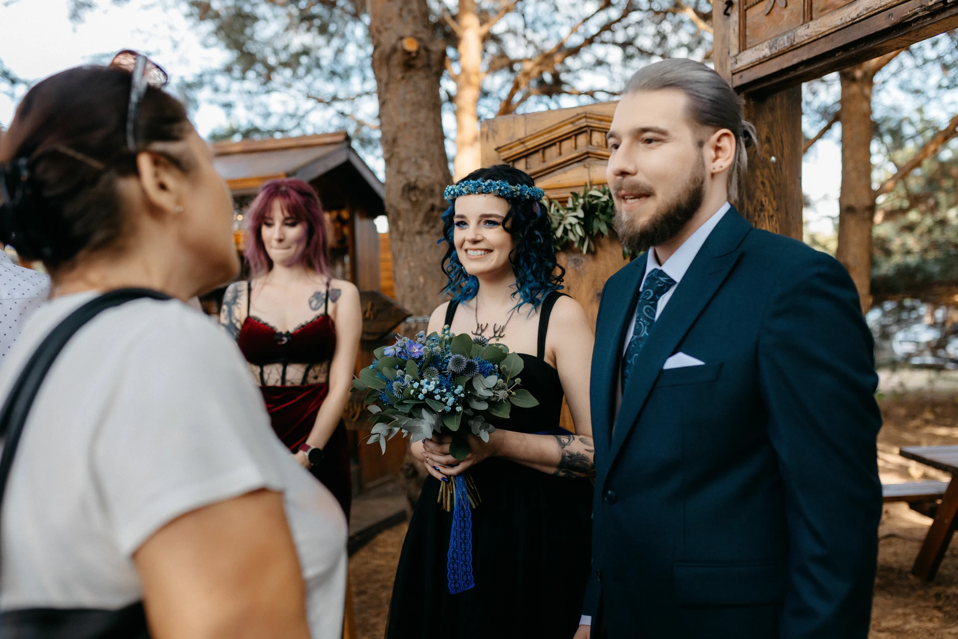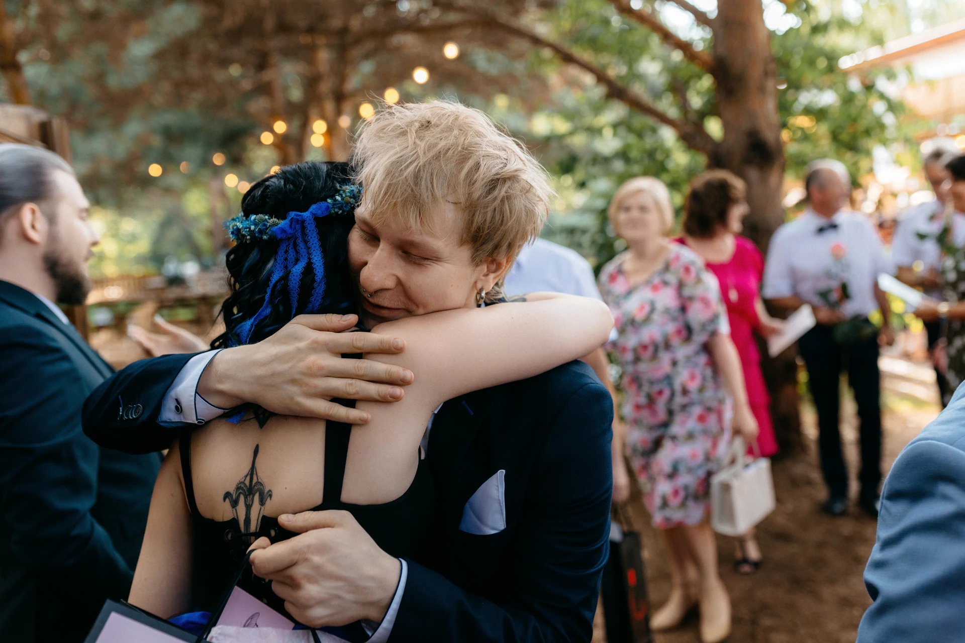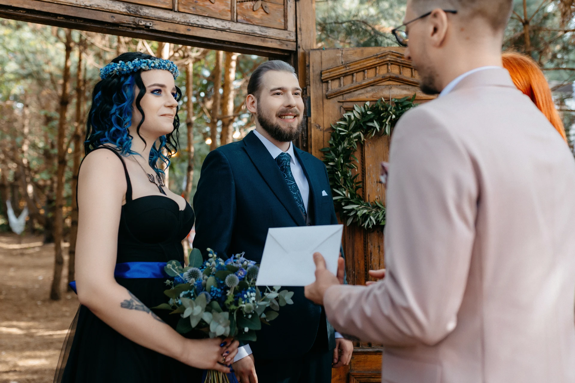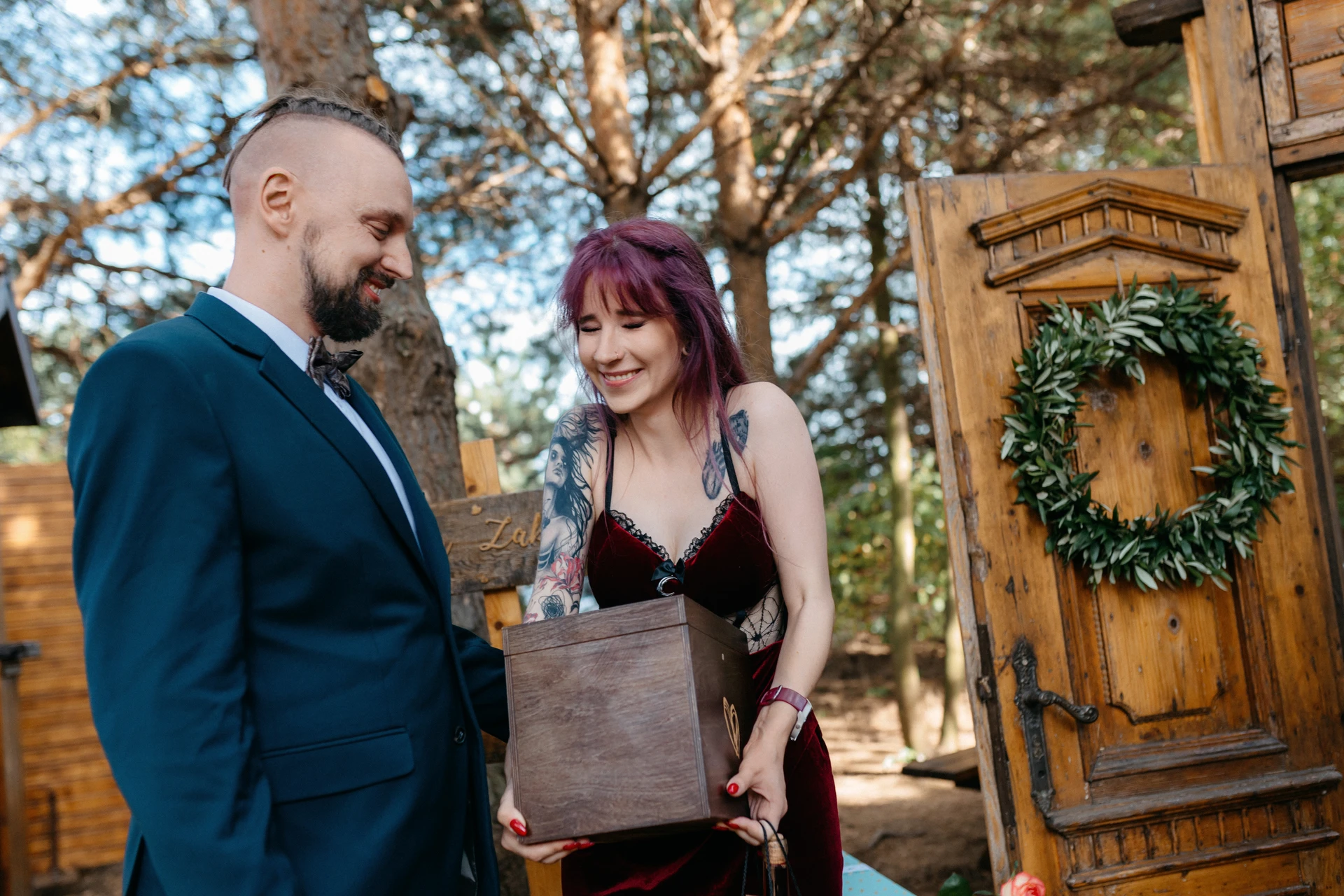 Ceremonia ślubu cywilnego Julii i Mateusza odbyła się w Miodowym Zakątku, miejscu, które wprost idealnie nadaje się do powiedzenia „tak” blisko natury. Altanka ślubna, otoczona przez wysokie drzewa jest totalnie częścią leśnego krajobrazu. Wyobraźcie sobie ciepły lipcowy dzień, słońce przedzierające się przez liście, delikatny wiatr poruszający gałęziami – dokładnie tak wyglądała ta magiczna ceremonia. Goście zebrali się wokół altanki, a atmosferę co i rusz wypełniały wzruszenia i szczere, szerokie uśmiechy.