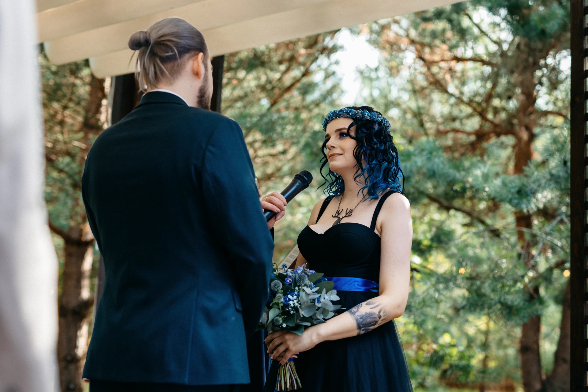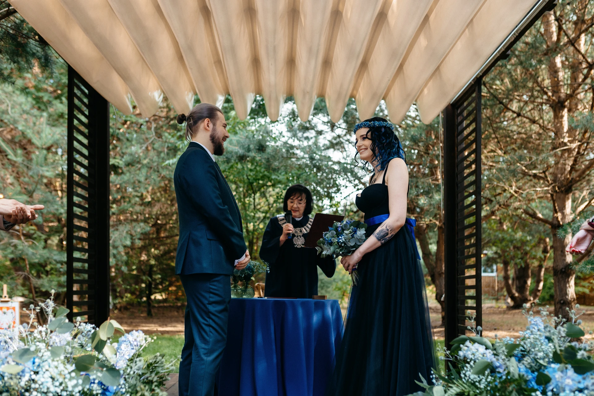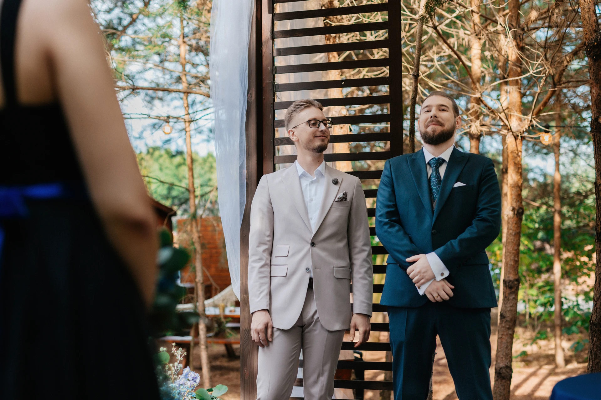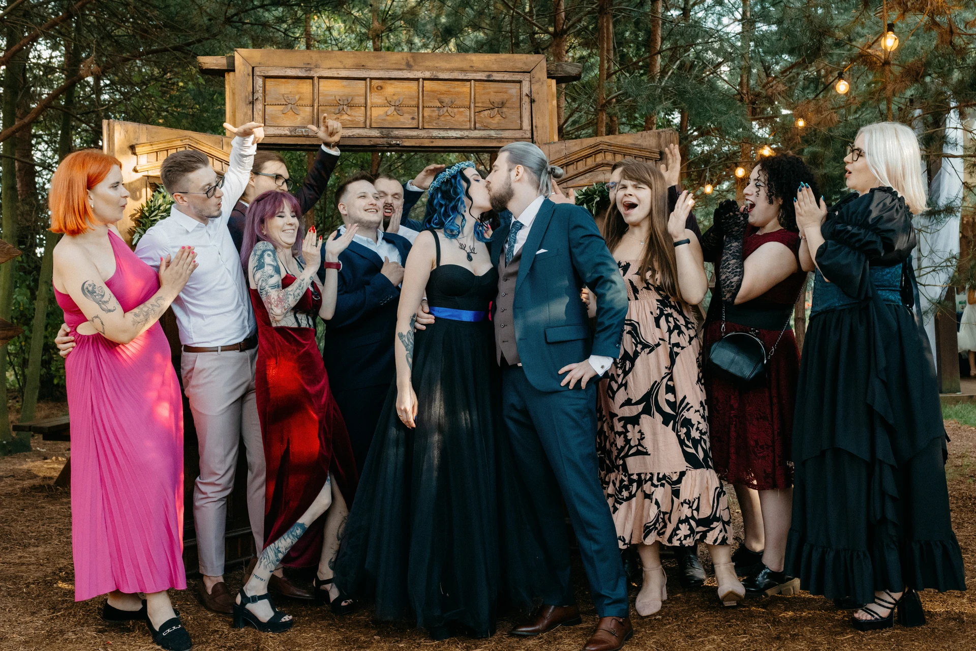 Ceremonia ślubu cywilnego Julii i Mateusza odbyła się w Miodowym Zakątku, miejscu, które wprost idealnie nadaje się do powiedzenia „tak” blisko natury. Altanka ślubna, otoczona przez wysokie drzewa jest totalnie częścią leśnego krajobrazu. Wyobraźcie sobie ciepły lipcowy dzień, słońce przedzierające się przez liście, delikatny wiatr poruszający gałęziami – dokładnie tak wyglądała ta magiczna ceremonia. Goście zebrali się wokół altanki, a atmosferę co i rusz wypełniały wzruszenia i szczere, szerokie uśmiechy.