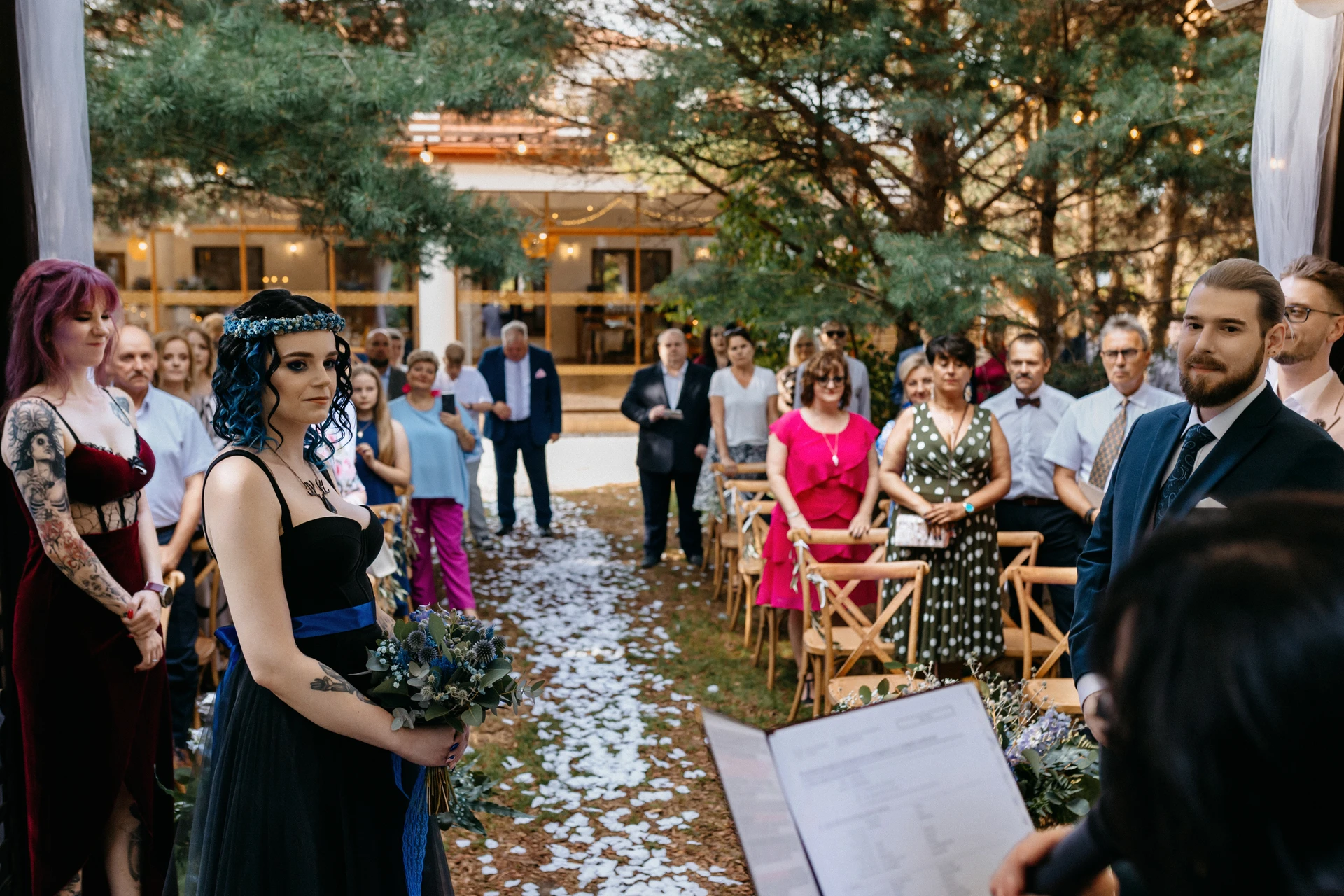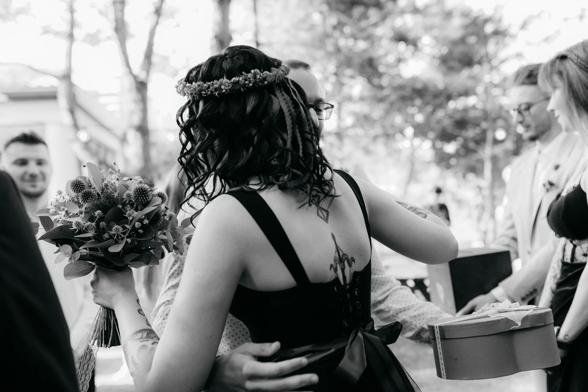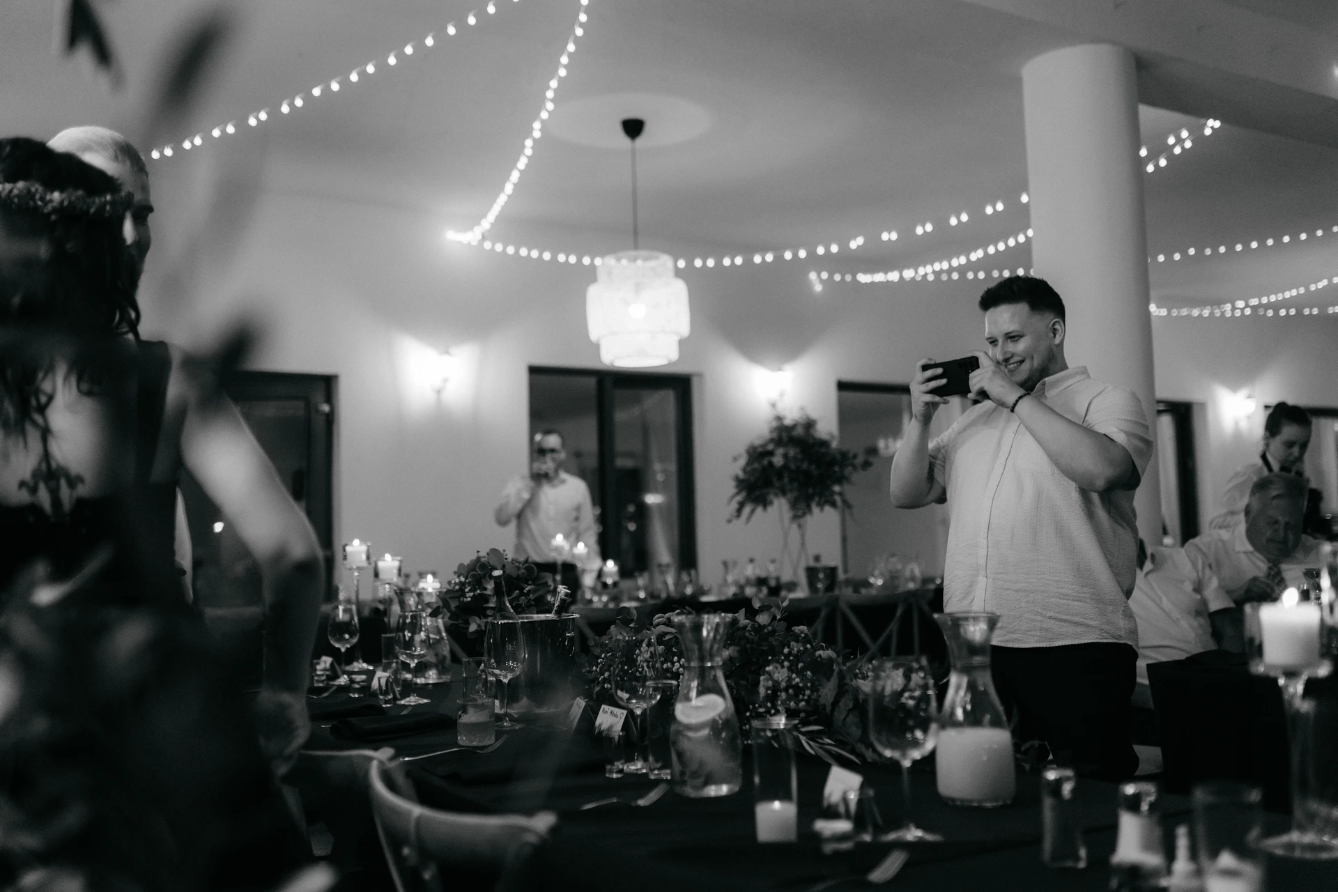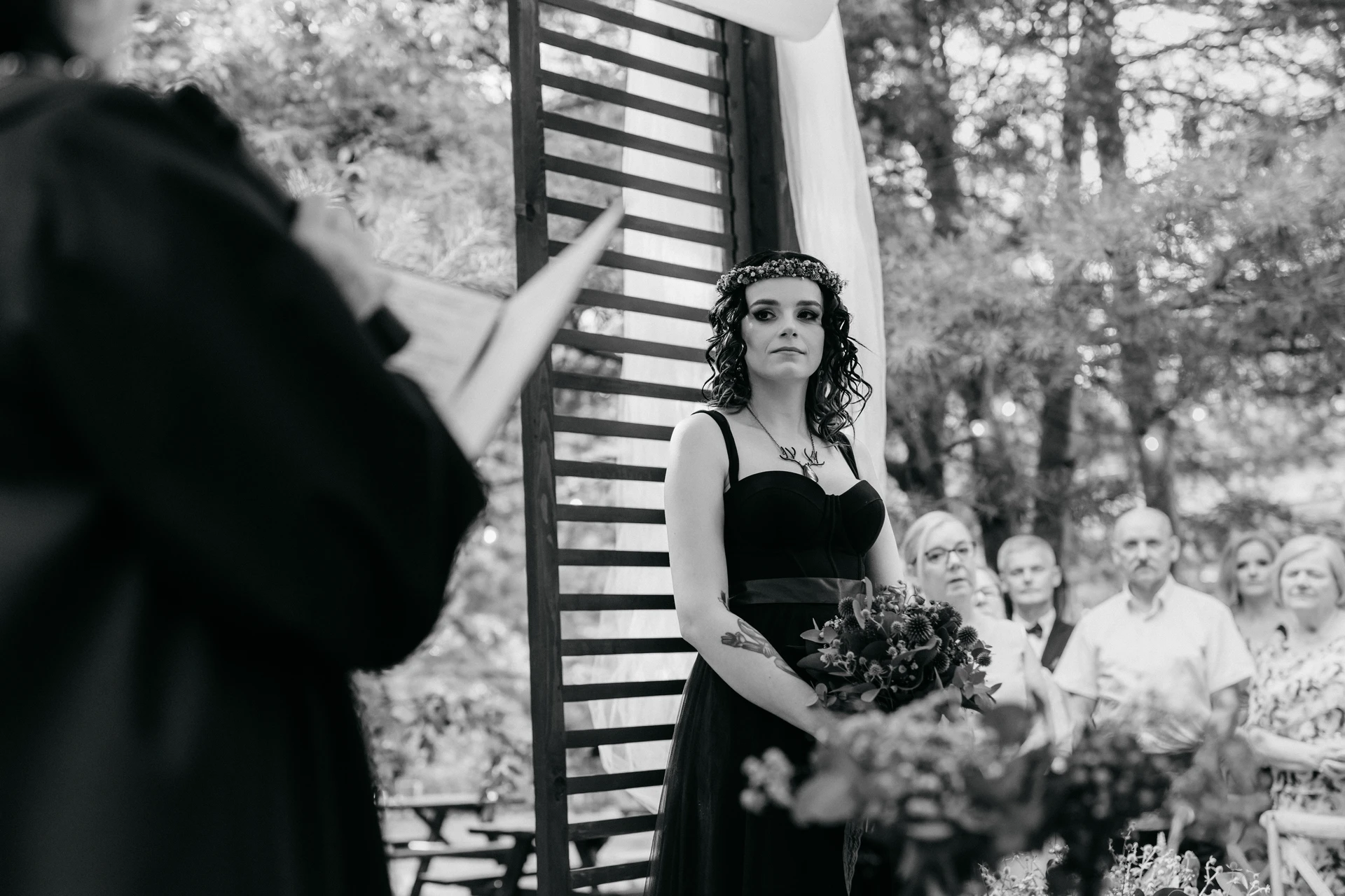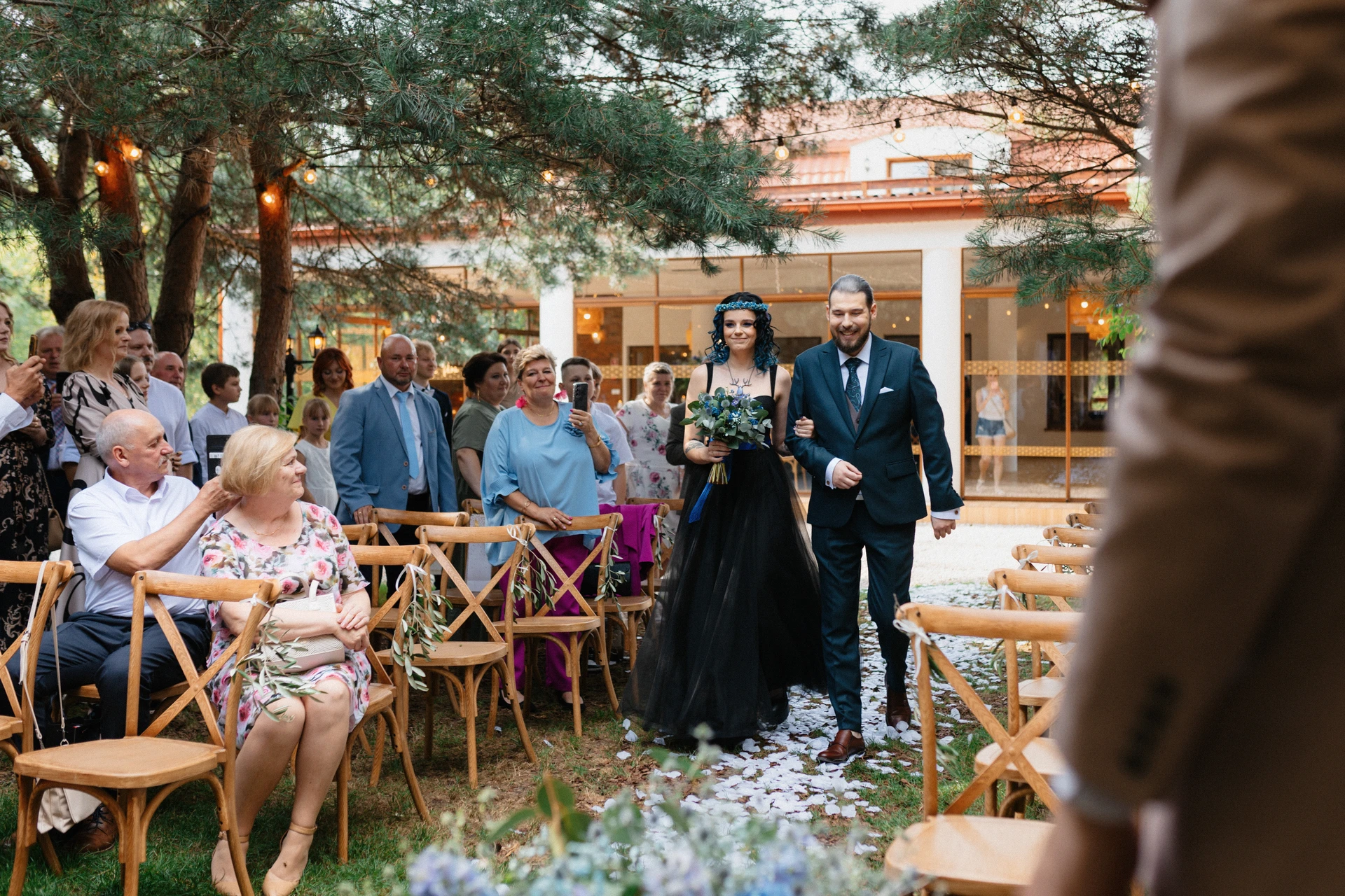 Ale… najciekawszym i najbardziej nieoczywistym dla nas punktem przygotowań okazała się suknia Julii. I to nie byle jaka – czarna! Powiedzieć, że było to zaskoczenie, to mało. Wybór totalnie poza schematami, a jednocześnie tak idealnie pasujący do jej osobowości. I szczerze – uwielbiamy, gdy pary decydują się na coś nietypowego, coś, co odzwierciedla ich prawdziwy charakter. Czarna suknia Julii to dowód na to, że śluby mogą być tak różnorodne, jak ludzie, którzy je celebrują. Nic nie cieszy nas bardziej niż widok zakochanych w sobie ludzi, którzy biorą ślub na własnych zasadach, bo w końcu to ich dzień, ich historia i ich chwile, które zostaną z nimi na zawsze.