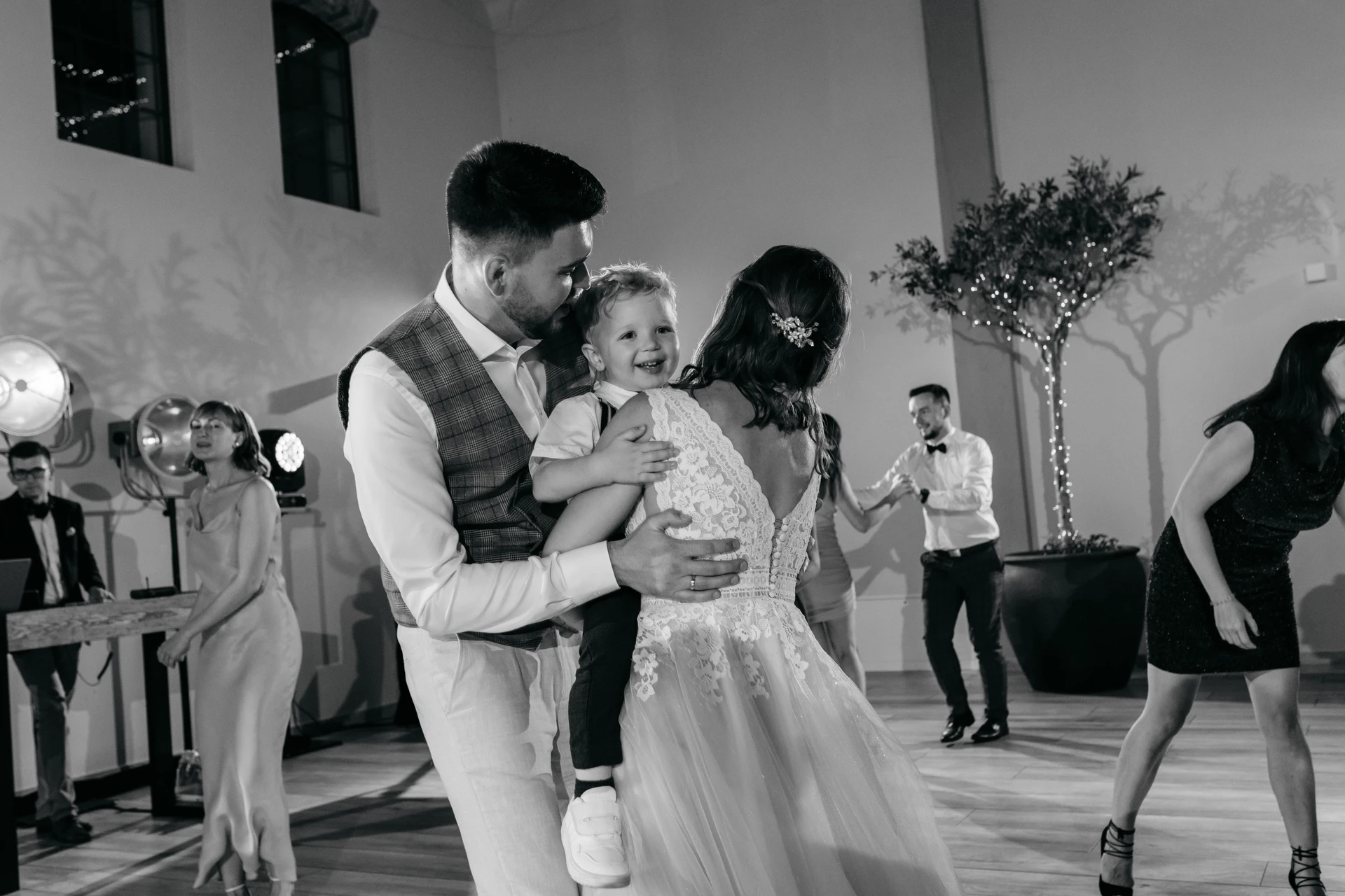 Villa Julianna wewnątrz też ma sporo uroku. Wysoki strop z podwieszonymi światełkami daje niesamowity efekt – sala wma trochę włoski vibe. Do tego antresola, która pozwala złapać parkiet z zupełnie innej perspektywy i daje nam, fotografom, fajne możliwości na bardziej kreatywne kadry. Chwytając z tego punktu szeroką perspektywę, można świetnie uchwycić dynamikę tańczących gości albo ten moment. I podczas wesela Oli i Karola wielokrotnie nam się to udało.